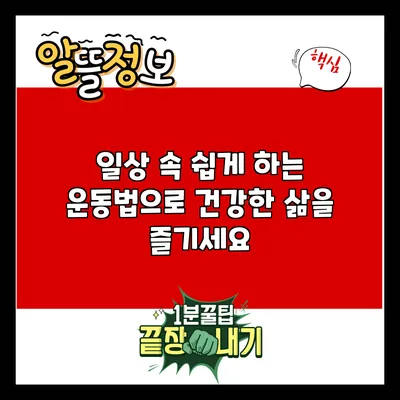 일상 속에서 쉽게 할 수 있는 운동법은 건강을 지키는데 큰 역할을 해요. 일상 운동을 통해 몸과 마음의 건강을 챙길 수 있어요. 지금 바로 실천해보세요. 작은 변화가 큰 결과로 이어진답니다. 운동은 복잡할 필요가 없으며, 자연스럽게 우리의 생활 속에 녹아들 수 있어요. 건강한 삶을 위해 오늘부터 운동을 시작해보는 것은 어떠세요?